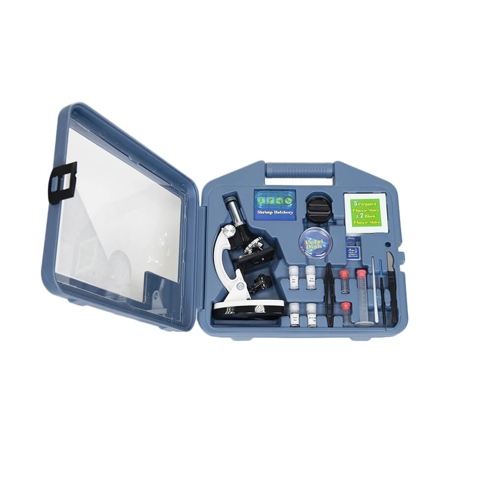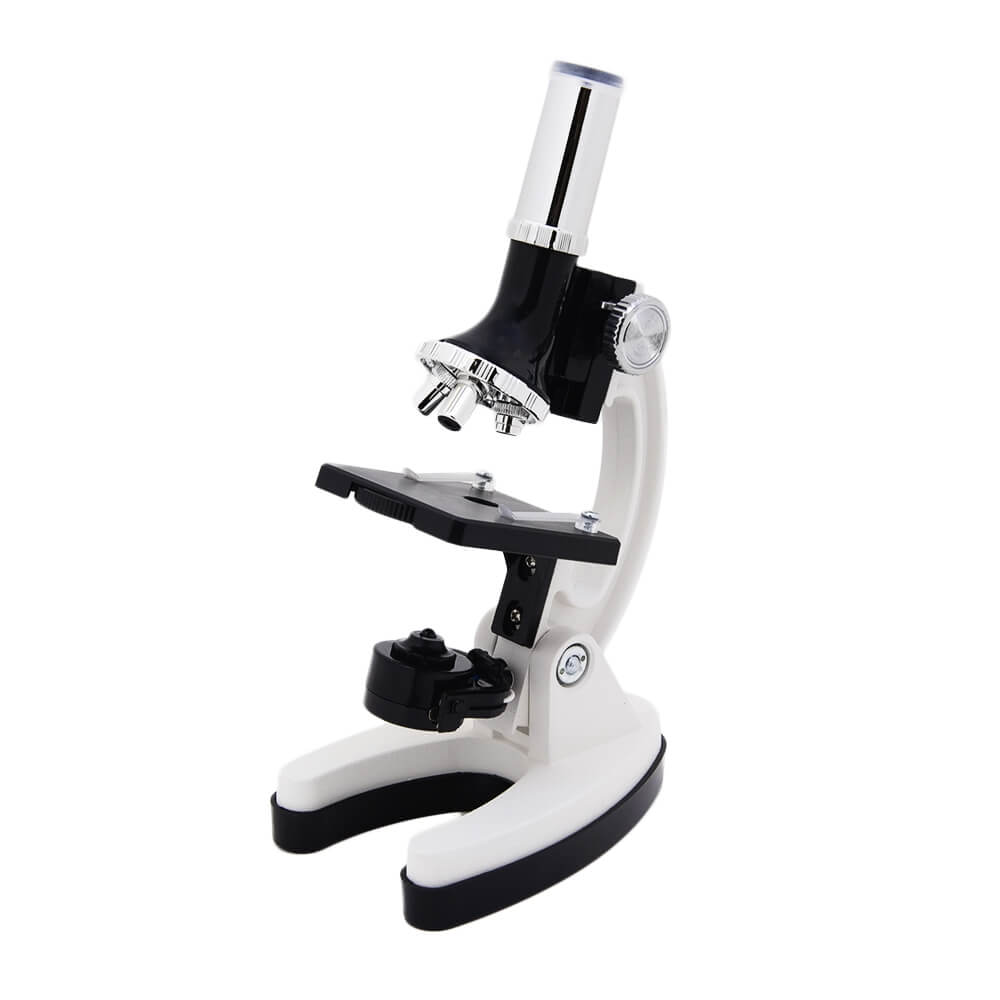 Микроскоп 300x-1200x — это оптический прибор для детей от 8 лет. Устройство оснащено тремя объективами кратностью 30x, 60x, 120x. Предусмотрена возможность двойной регулировки фокусировки изображения: с помощью винтов и окуляра. Монокулярная насадка с регулируемым углом наклона обеспечивает высокую четкость картинки. В комплектацию входит удобный, жесткий кейс для транспортировки и полноценный набор для проведения опытов: пробирка, щипцы, предметное стекло, цилиндр с делениями, пинцет, пластиковые контейнеры для образцов.